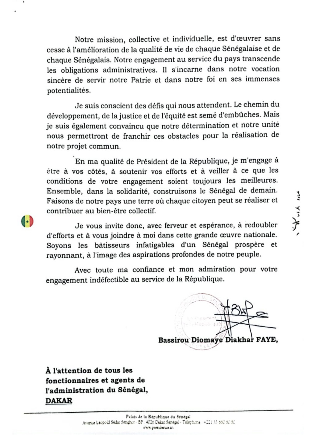 Lettre du président de la république Bassirou Diomaye FAYE aux fonctionnaires «Jub Jubal Jubanti»
